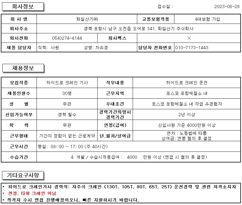 658 [강우중기] 인천 동국제강 내 고철장 천장크레인 운전원 모집합니다